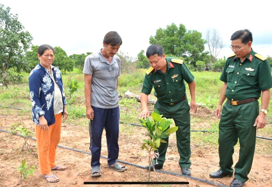 Đại tá Nguyễn Thế Thái, Đoàn trưởng Đoàn Kinh tế-Quốc phòng 737 hướng dẫn kỹ thuật trồng, chăm sóc cây mít Thái cho gia đình ông Hồ Văn Thành ở thôn 6, xã Ia Rvê, tỉnh Đắk Lắk.
