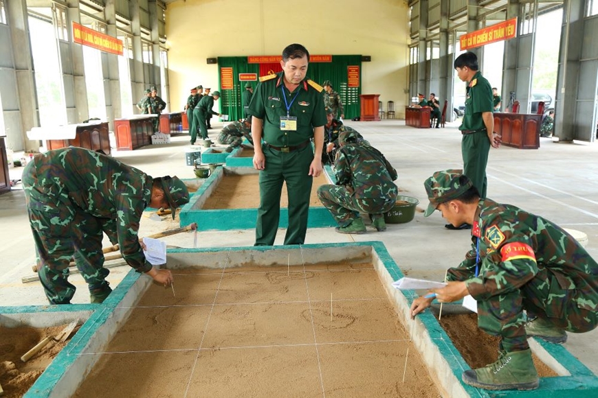 Phân đội Trinh sát Lữ đoàn Pháo binh 75 thực hiện phần thi đắp sa bàn địa hình. |