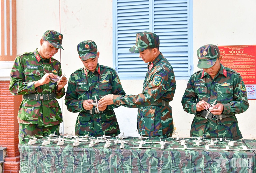 | Cán bộ, chiến sĩ Đại đội 512 (Lữ đoàn Pháo Phòng không 226, Quân khu 9) chuẩn bị mô hình máy bay. |