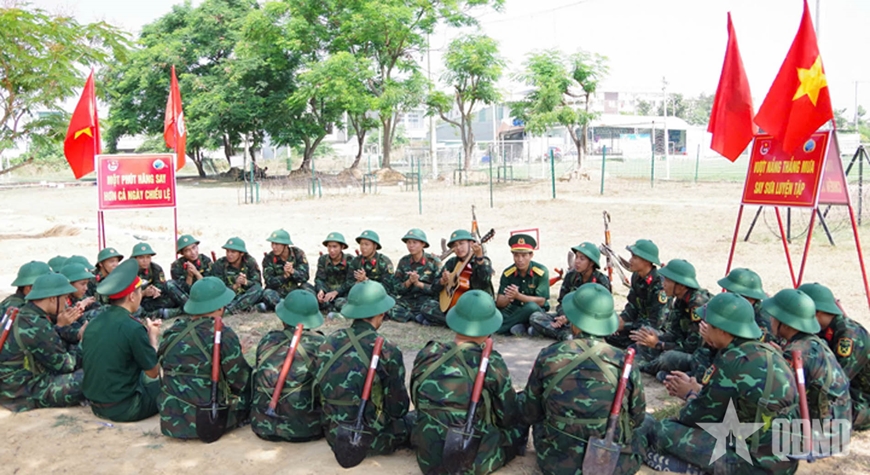 | Cán bộ, chiến sĩ vui văn nghệ sau giờ huấn luyện. |