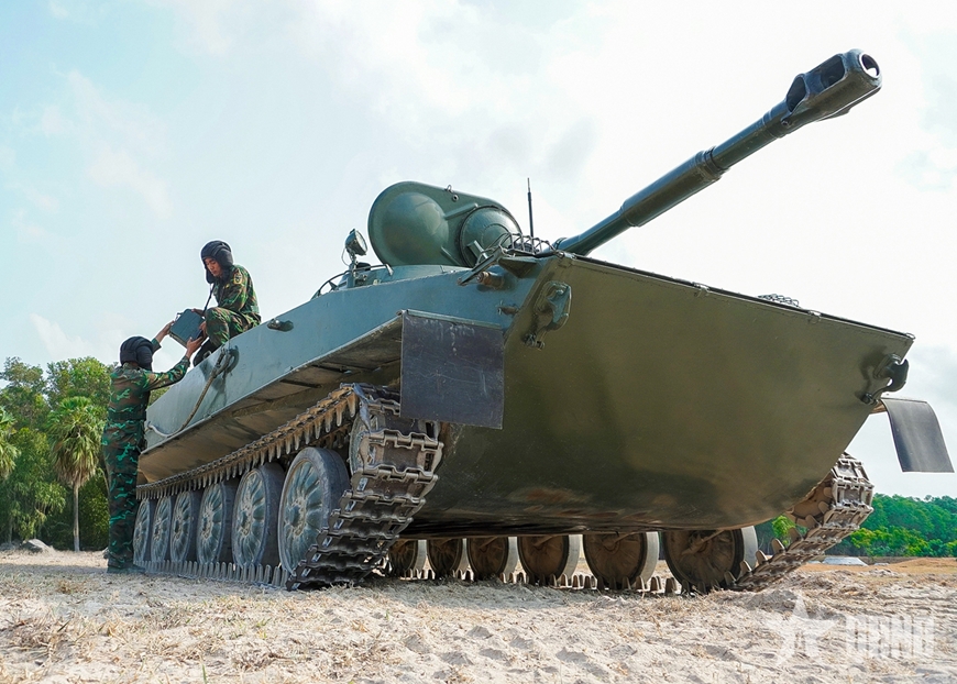 Các thành viên kíp xe Lữ đoàn Tăng thiết giáp 416 (Quân khu 9) kiểm tra đạn pháo 76,2mm, bảo đảm an toàn trước khi bước vào bài kiểm tra bắn bài 2B. |
