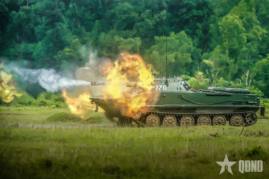 Lửa và khói bùng lên giữa thao trường khi xe tăng số hiệu 170 của Lữ đoàn Tăng thiết giáp 416 khai hỏa. |