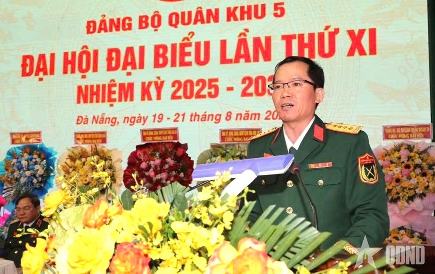 Đại tá Lương Đình Chung, Bí thư Đảng ủy, Chính ủy Quân khu 5 phát biểu tại Đại hội đại biểu Đảng bộ Quân khu 5 lần thứ XI nhiệm kỳ 2025-2030.