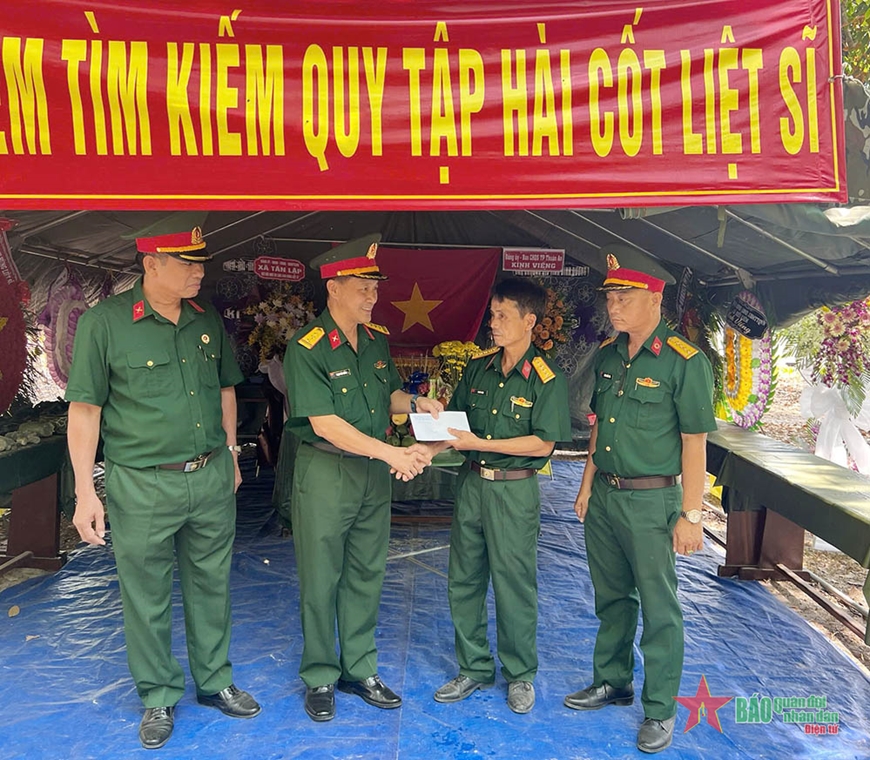 Lãnh đạo Ban CHQS TP Thuận An tặng quà động viên lực lượng tìm kiếm hài cốt liệt sĩ.