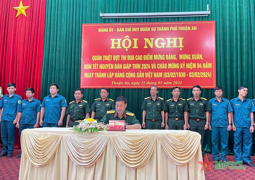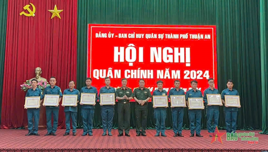 Trong năm 2024, TP Thuận An thực hiện giao quân đạt 100% chỉ tiêu ở cả 2 cấp, trong đó tỷ lệ đảng viên nhập ngũ chiếm 1,5%. Ban CHQS từ thành phố đến các xã, phường duy trì nghiêm chế độ trực sẵn sàng chiến đấu, phối hợp với Công an tổ chức hàng trăm cuộc tuần tra, canh gác bảo vệ an toàn mục tiêu trọng điểm với hàng nghìn lượt chiến sĩ dân quân thường trực tham gia.