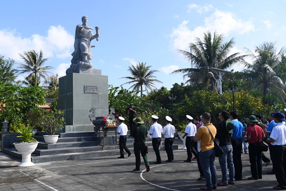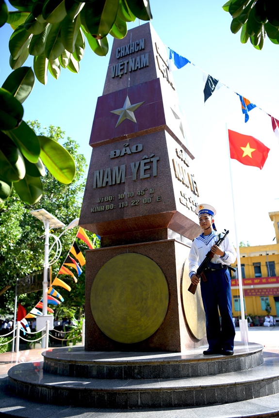 Bia chủ quyền, tượng đài Hưng Đạo Vương Trần Quốc Tuấn, nhà khách trên đảo, được bao quanh bởi một màu xanh mát. |