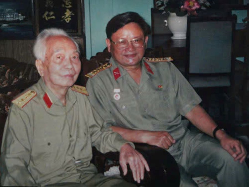 | Đại tá Hoàng Minh Phương trong một lần đến thăm Đại tướng Võ Nguyên Giáp. Ảnh do gia đình nhân vật cung cấp |