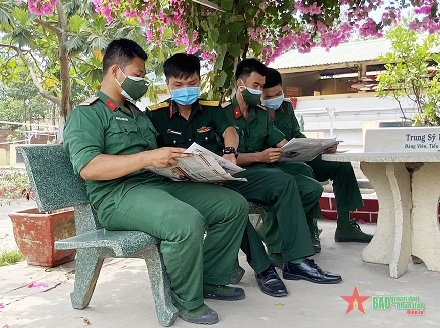 | Cán bộ thuộc Tiểu đoàn 7, Trung đoàn 31 (Sư đoàn 309, Quân đoàn 4) cùng chiến sĩ đọc sách, báo trong giờ nghỉ. Ảnh: TRUNG HIẾU |