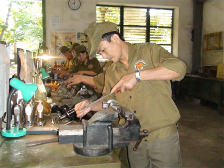 Công nhân Xí ngiệp X55, Cục Quân huấn, Bộ Tổng Tham mưu gia công các chi tiết của sản phẩm phục vụ huấn luyện. Ảnh: Ngọc Anh