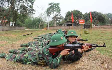 Thượng úy Nguyễn Văn Chuẩn, Chính trị viên phó Đại đội 8 (Tiểu đoàn 5, Trung đoàn 148, Sư đoàn 316) kiểm tra đường ngắm cho chiến sĩ mới. Ảnh: Hồng Sáng.