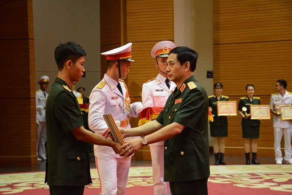 Thượng tướng Phan Văn Giang trao bằng khen của Bộ trưởng Bộ Quốc phòng tặng các học viên tốt nghiệp thủ khoa xuất sắc năm 2019. Ảnh: DUY ĐÔNG.