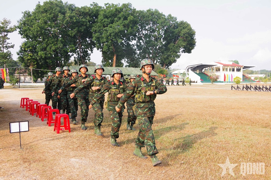 | Chiến sĩ mới Sư đoàn 5 cơ động theo điều lệnh chính quy trong huấn luyện. |