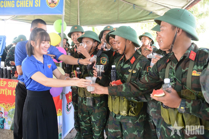 | Đoàn viên, thanh niên xã An Nhơn Tây (TP Hồ Chí Minh) tặng nước uống, trái cây cho chiến sĩ mới Trung đoàn Gia Định trong mô hình "Tiếp sức mùa huấn luyện". |