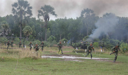 Đùng, đoàng… tiếng súng, tiếng mìn hòa trong tiếng xung phong đầy khí thế quyết tâm tiêu diệt “địch” của cán bộ, chiến sĩ Tiểu đoàn 303, Trung đoàn 1, Sư đoàn 330 vang vọng dưới chân núi Cấm. Sau giây phút bất ngờ, từ phía trận địa phòng thủ, hỏa lực của quân “địch” bắt đầu đánh trả. Trên trời từng tốp máy bay “địch” quần đảo, điên cuồng ném bom, bắn phá dữ dội... Trong tình thế nguy cấp, những chiếc máy bay Su30 của không quân ta đã kịp thời xuất hiện công kích mục tiêu, đánh chặn không quân địch, biên đội trực thăng vũ trang đánh phá các mục tiêu trong chiều sâu phòng ngự của địch. Với sự chi viện của không quân, pháo binh, pháo cao xạ, tăng thiết giáp, ta đã hoàn toàn làm chủ trận địa...