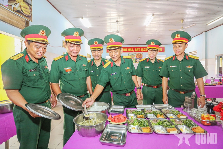 | Kiểm tra công tác bảo đảm bữa ăn của bộ đội tại Trung đoàn 31, Sư đoàn 309, Quân khu 7. Ảnh: LÊ TIẾN |