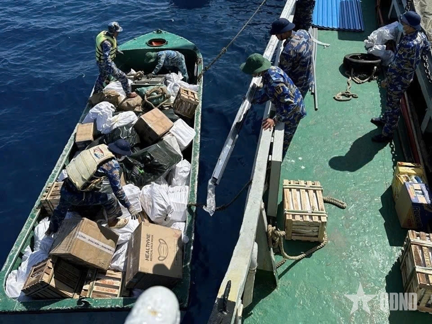 | Vận chuyển hàng từ tàu xuống xuồng chuyển tải để cấp cho các đảo. Ảnh: QUÂN HẢI |