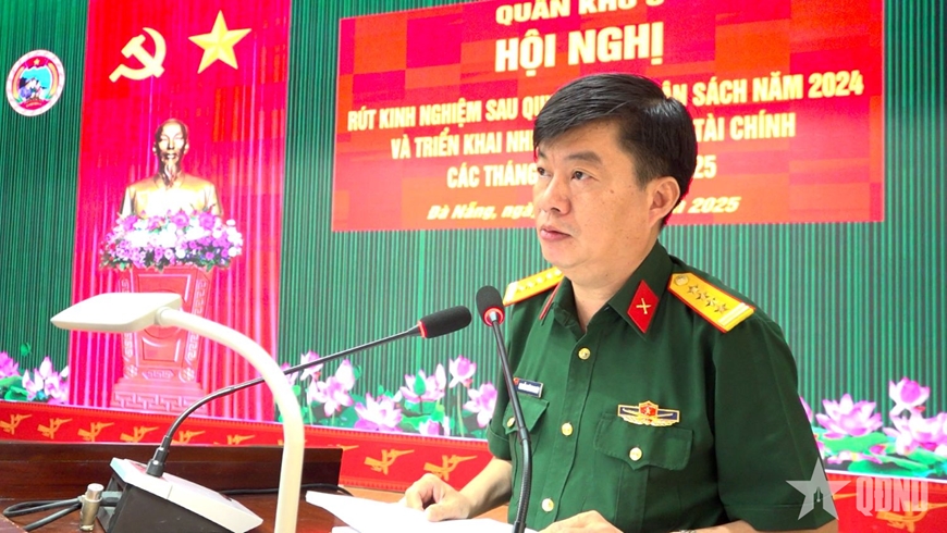| Đại tá Nguyễn Thành Nhơn, Trưởng Phòng Tài chính Quân khu 5 phát biểu tại Hội nghị rút kinh nghiệm sau quyết toán và triển khai nhiệm vụ công tác tài chính năm 2025. Ảnh: TRỊNH VĂN |