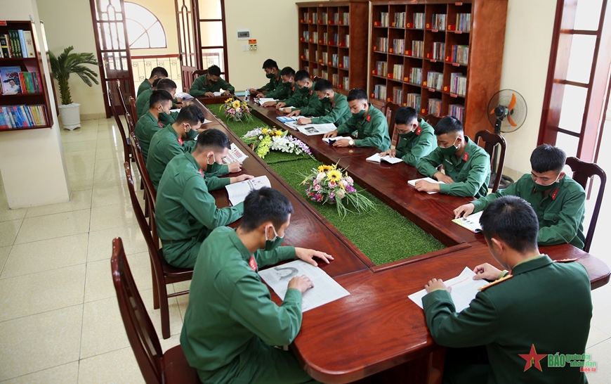 | Giờ đọc sách, báo của bộ đội tại Phòng Hồ Chí Minh Lữ đoàn Pháo binh 382. |