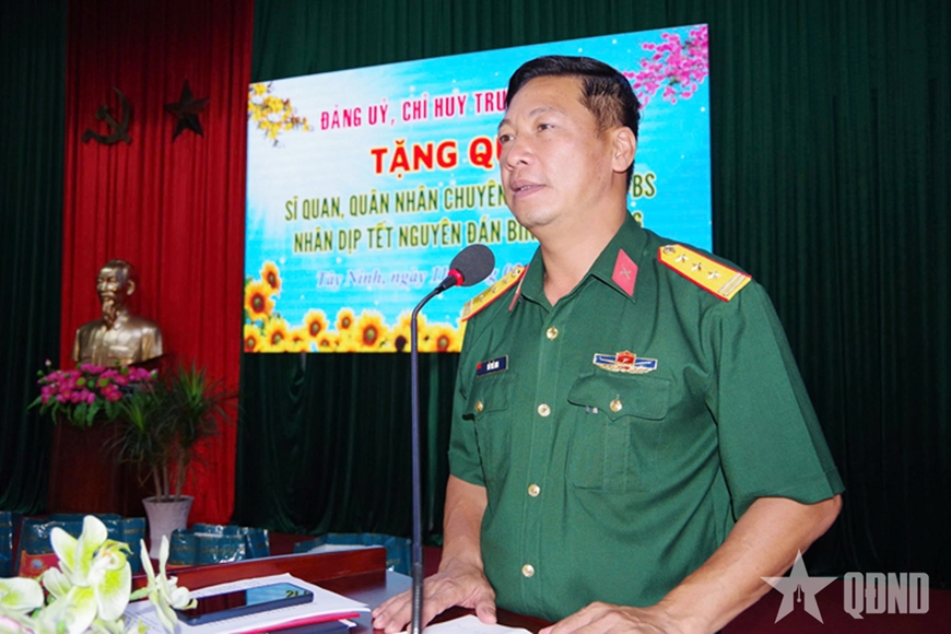 | Thượng tá Đỗ Thế Anh tặng quà các quân nhân có khó khăn của Trung đoàn 5. |
