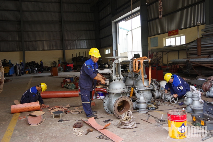 Trong không gian rộng lớn của nhà xưởng, tiếng máy cắt thép vang lên đều đặn, tiếng búa gõ nhịp nhàng, ánh lửa hàn sáng rực, từng tổ, đội bắt tay ngay vào công việc theo kế hoạch đã được phân công.