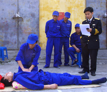 Công nhân Nhà máy X70 luyện tập kỹ thuật cấp cứu an toàn người lao động bị nạn.