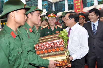 Đồng chí Phạm Quang Nghị, Ủy viên Bộ Chính trị, Bí thư Thành ủy Hà Nội và Trung tướng Phí Quốc Tuấn - Tư lệnh Bộ tư lệnh Thủ đô Hà Nội tặng quà thanh niên lên đường nhập ngũ đợt 2-2013. Ảnh: Hoàng Hải