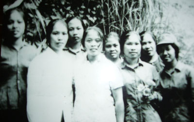 Chị Trần Thị Bình, (thứ tư từ trái qua) cùng đồng đội năm 1974 ở Trường Sơn lịch sử. Ảnh chụp lại