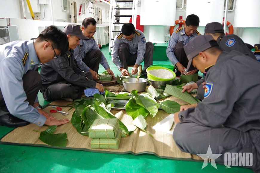 | Các tàu Kiểm ngư gói bánh chưng, chuẩn bị đón Tết trên biển. |