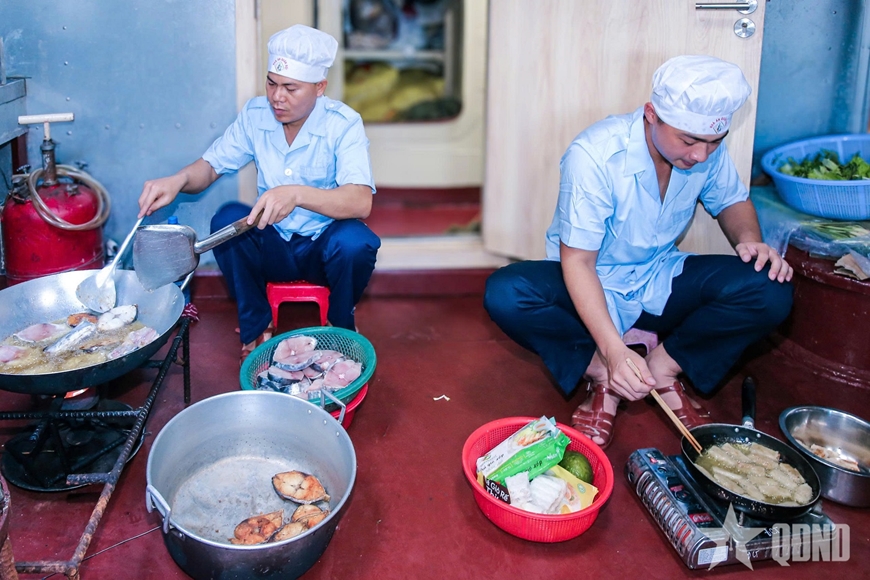 Sau khi rời bến cảng, con tàu bắt đầu hải trình lênh đênh trên biển. Sau khoảng 4 giờ đồng hồ rời bến, tiếng loa phát thanh đã vang lên thông báo “Kính mời thủ trưởng và các đại biểu tới phòng ăn dùng bữa trưa..”. Những khay thức ăn trên bàn với nhiều món ăn ngon, được chế biến cẩn thận không kém đất liền như: Sườn xào chua ngọt, cá sốt cà chua, thịt bò xào cần tây, chả giò chiên... khiến các thành viên trong đoàn công tác không khỏi cảm phục. Mặc dù làm việc trong điều kiện không gian bếp chật hẹp, nóng bức, chênh vênh, nghiêng ngả vì sóng biển nhưng với tinh thần trách nhiệm cao, các đồng chí trong tổ hậu cần vẫn chế biến được những món ăn đa dạng, đầy đủ dinh dưỡng.