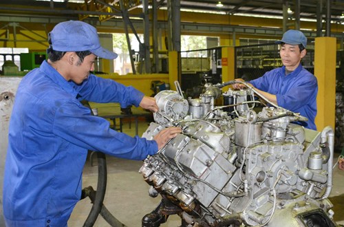 Đoàn viên công đoàn Xưởng X79 (Cục Kỹ thuật, Quân khu 1) bảo dưỡng động cơ xe ô tô. |