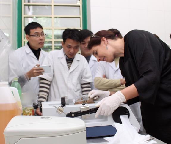 Nhóm nghiên cứu đề tài thảo luận cùng chuyên gia về phân tích ADN mẫu xét nghiệm. |