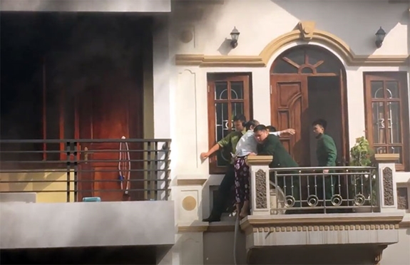 Hình ảnh cán bộ chiến sĩ Cục Điều tra Hình sự, Bộ Quốc phòng cứu người giúp việc ra khỏi đám cháy. |