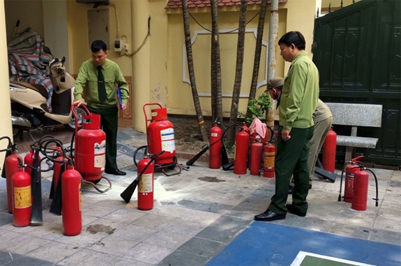 Cán bộ, chiến sĩ Cục Điều tra Hình sự, Bộ Quốc phòng kiểm đếm lại số bình chữa cháy vừa sử dụng. |