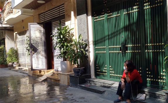 Chị Phạm Thị Thu Hà dường như chưa hết bàng hoàng đang ngồi trước cửa nhà hàng xóm, ngay cạnh ngôi nhà của mình (nhà bên trái) vừa xảy ra cháy. |
