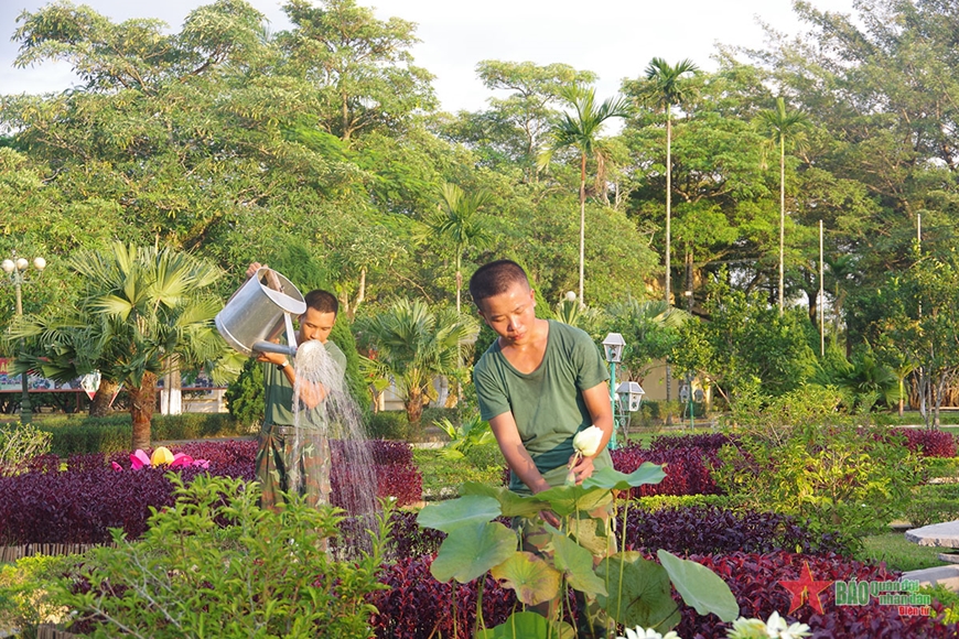 | Cán bộ, chiến sĩ tranh thủ giờ nghỉ chăm sóc bồn hoa, cây cảnh. |