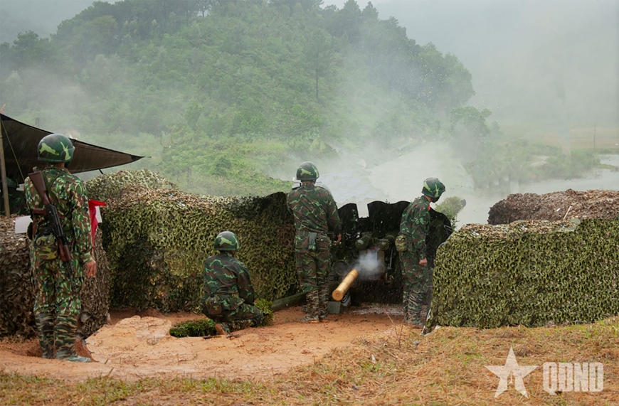 Theo hiệp đồng, khẩu lệnh của Thượng úy Lê Trọng Nhung, Trung đội trưởng Trung đội 1 vang lên dõng dạc: “Khẩu đội bắn mục tiêu lô cốt số 13, đạn nổ phá, ngòi nổ ngay, liều giảm, góc tầm 0.10, độ hướng 30.0, ngắm chính giữa mục tiêu phát một nạp đạn”. Dứt khẩu lệnh, các pháo thủ nhanh chóng lấy phần tử, chuẩn bị đạn, kiểm tra hướng, tầm với thao tác chính xác, nhịp nhàng. Dứt khẩu lệnh “Bắn!” là tiếng nổ vang trời, lửa từ nòng pháo phun ra đỏ rực, mặt đất rung nhẹ, khói cuộn trắng một góc thao trường và mục tiêu bị diệt ngay từ quả đạn đầu tiên. “Đó là minh chứng cho kết quả rèn luyện vất vả của cán bộ, chiến sĩ đơn vị trong thời gian qua”, Thượng tá Lê Văn Dũng, Trung đoàn trưởng Trung đoàn Pháo binh 452 hào hứng nói.