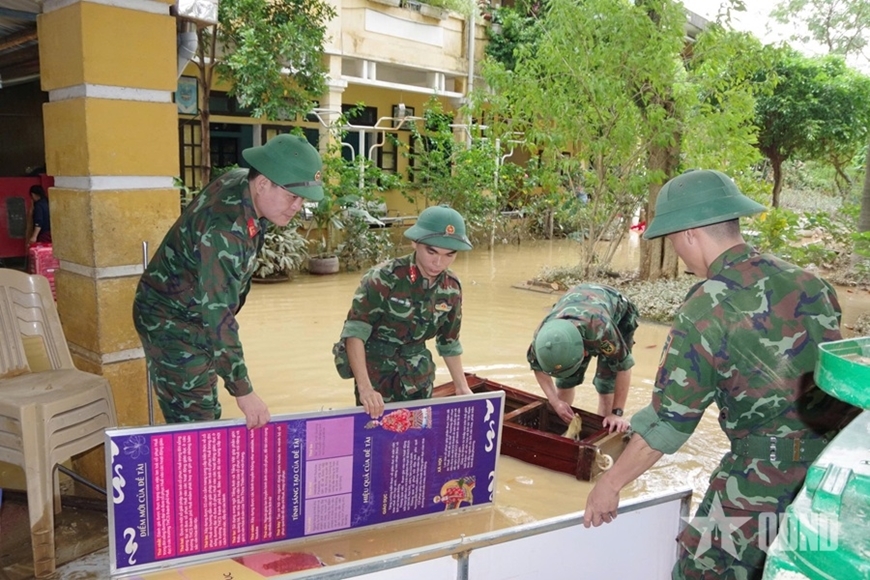 | Cán bộ, chiến sĩ Bộ CHQS TP Huế tham gia khắc phục hậu quả mưa lũ tại Trường THCS Chu Văn An. |