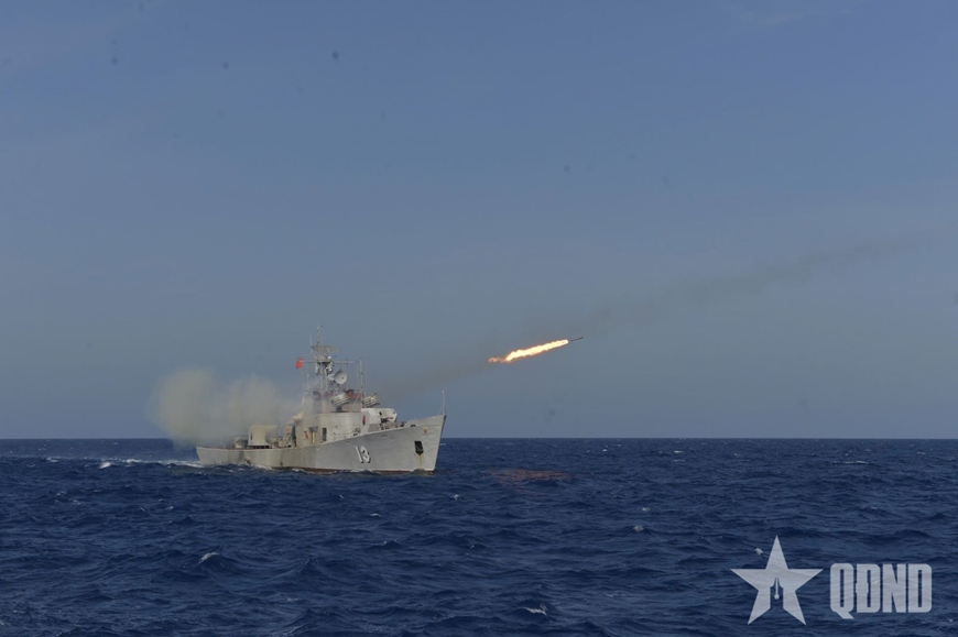 | Tàu 13 của Lữ đoàn 171, Vùng 2 Hải quân tiêu diệt mục tiêu trên biển bằng bom phản lực. |