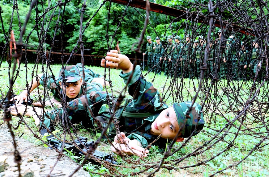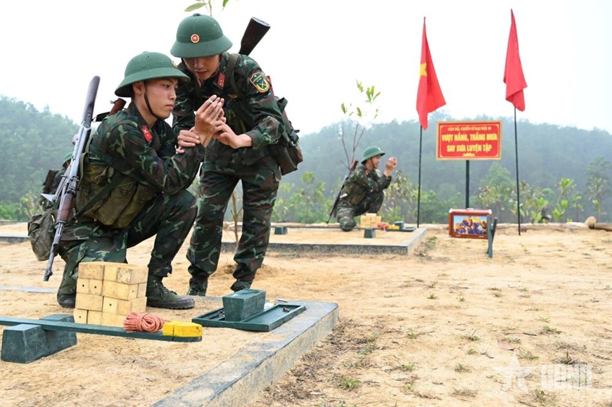 Cán bộ, chiến sĩ Đại đội 1 (Tiểu đoàn Trinh sát 31, Bộ Tham mưu Quân khu 3) huấn luyện kỹ thuật khắc phục vật cản. Ảnh: TRƯỜNG VĂN |