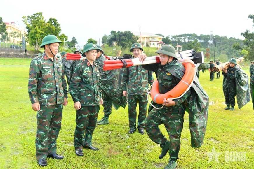 Thiếu tướng Lương Văn Kiểm, Tư lệnh Quân khu 3 (thứ hai, từ trái sang) kiểm tra công tác phòng, chống bão số 9 tại Lữ đoàn 242, tháng 9-2025. Ảnh: THIỆN MINH
