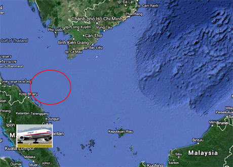 | Khu vực nghi chiếc máy bay của Ma-lai-xi-a bị rơi (khoanh tròn đỏ). Ảnh: THÚY HẠNH (VNN). |
