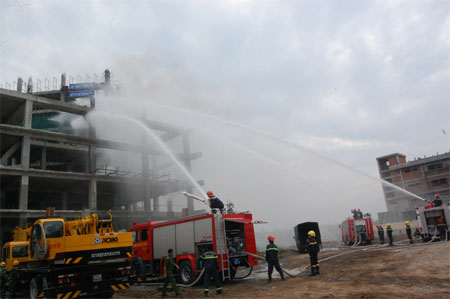 Các lực lượng tham gia thực hành tình huống cứu hỏa, cứu sập công trình khu chung cư.