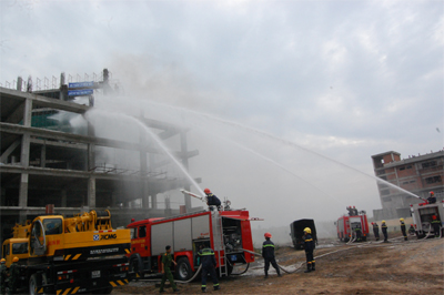 | Các lực lượng tham gia thực hành tình huống cứu hỏa, cứu sập công trình khu chung cư. |