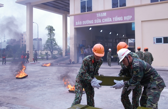 Cán bộ, chiến sĩ các cơ quan Sư đoàn Bộ binh 301 luyện tập phương án phòng, chống cháy Trạm Sửa chữa bảo dưỡng tổng hợp. |