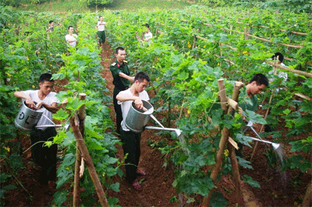 | Chiến sĩ ở Đại đội 11, Tiểu đoàn 6 chăm sóc vườn bí xanh. |