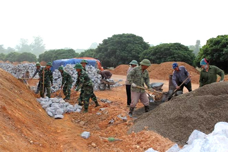 Cán bộ, chiến sĩ Lữ đoàn giúp nhân dân trên địa bàn đóng quân làm đường liên thôn.