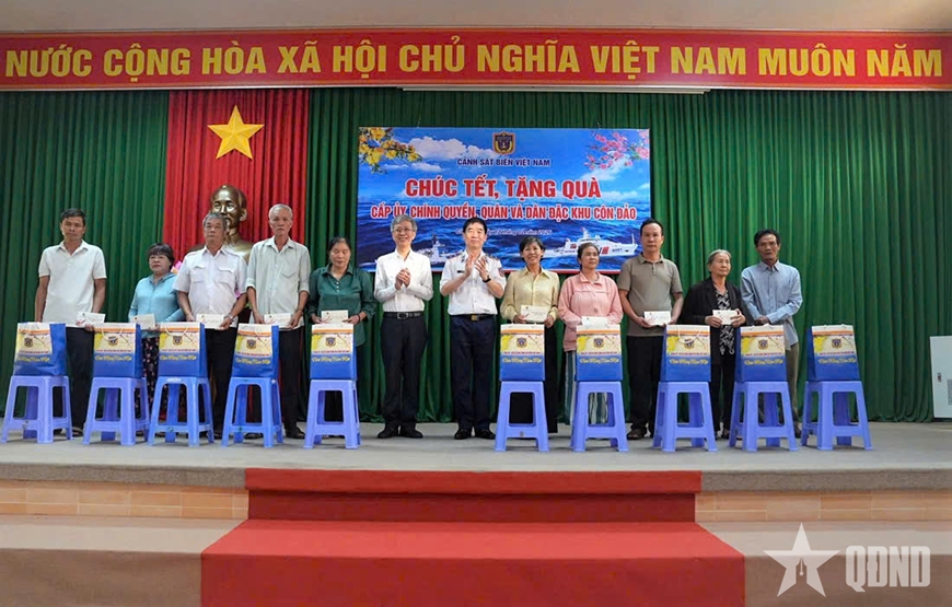 | Lãnh đạo Cảnh sát biển Việt Nam trao cờ Tổ quốc, ảnh Bác Hồ cùng quà tặng ngư dân tại Đặc khu Côn Đảo (Thành phố Hồ Chí Minh) tháng 12-2025. |