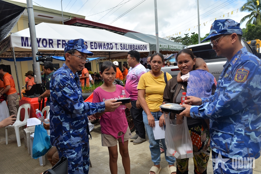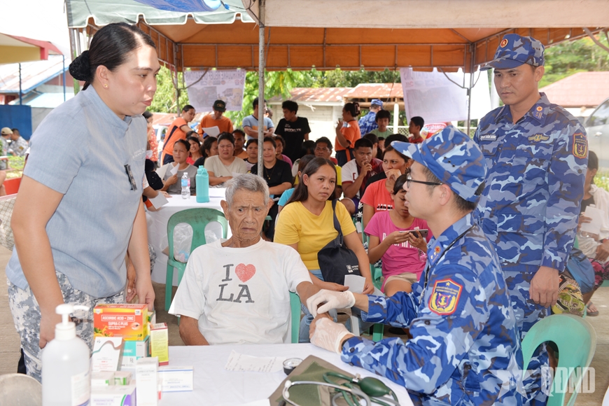 | Cán bộ quân y trên Tàu CSB 8002 (Vùng Cảnh sát biển 2) khám bệnh, cấp thuốc cho người dân vùng động đất của tỉnh Cebu (Philippines) tháng 10-2025. |