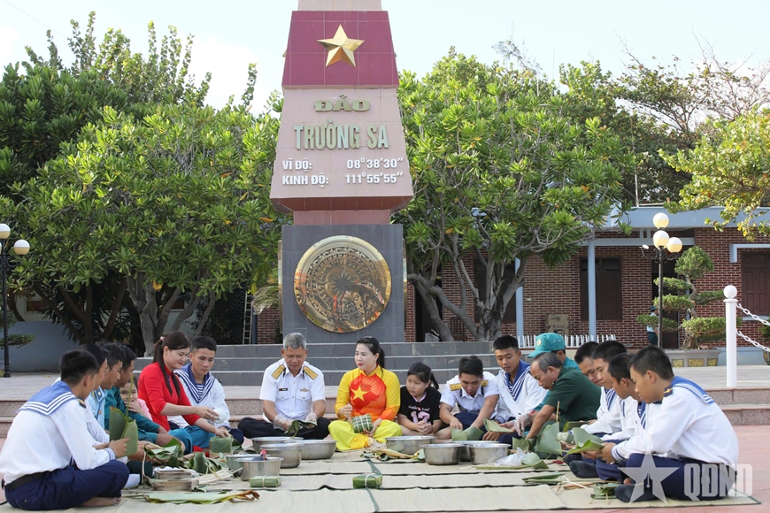 | Quân và dân đặc khu Trường Sa (Khánh Hòa) cùng gói bánh chưng đón Tết Nguyên đán Bính Ngọ 2026 bên cột mốc chủ quyền. |