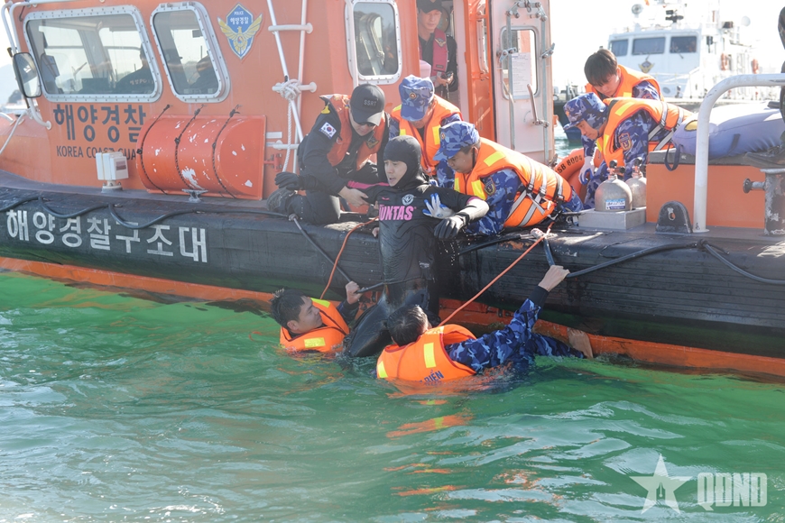 | Cán bộ, chiến sĩ Cảnh sát biển Việt Nam luyện tập cứu hộ, cứu nạn cùng nhân viên Lực lượng Bảo vệ bờ biển Hàn Quốc, tại Hàn Quốc tháng 11-2024. |